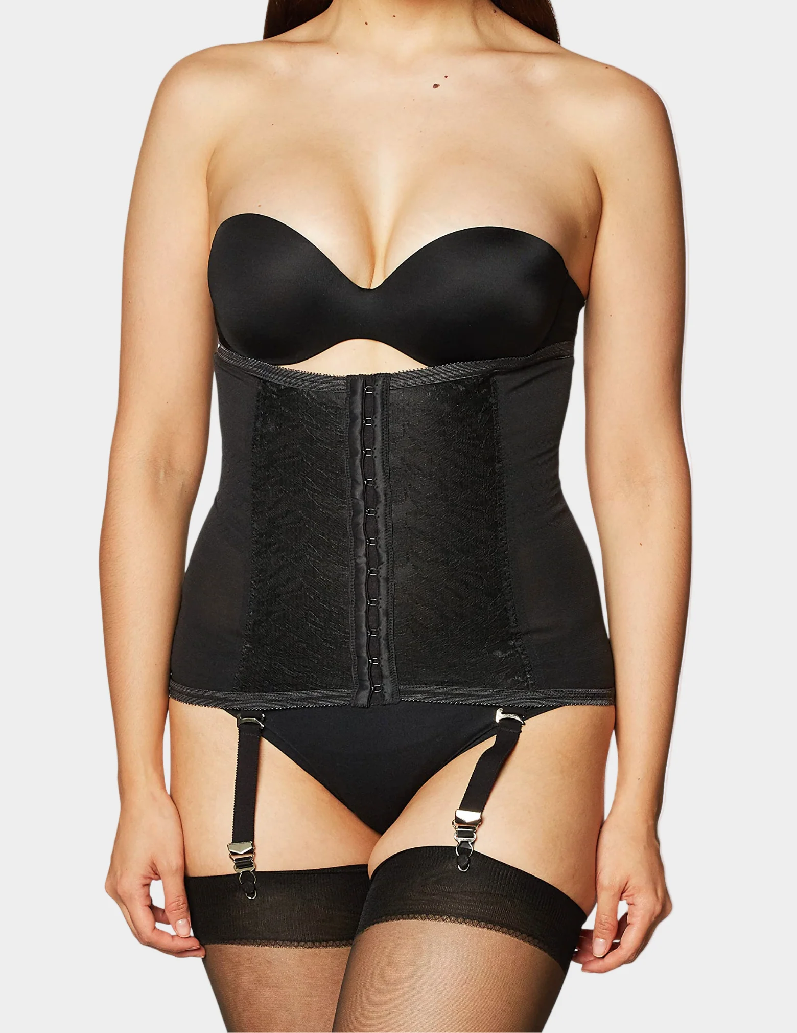 This waist training girdle with garters is made of firm control Power Net fabric made of 77% nylon, 23% Invista® Lycra® to stretch 2 ways. Features exclusive contour bands and spiral boning for back support.
