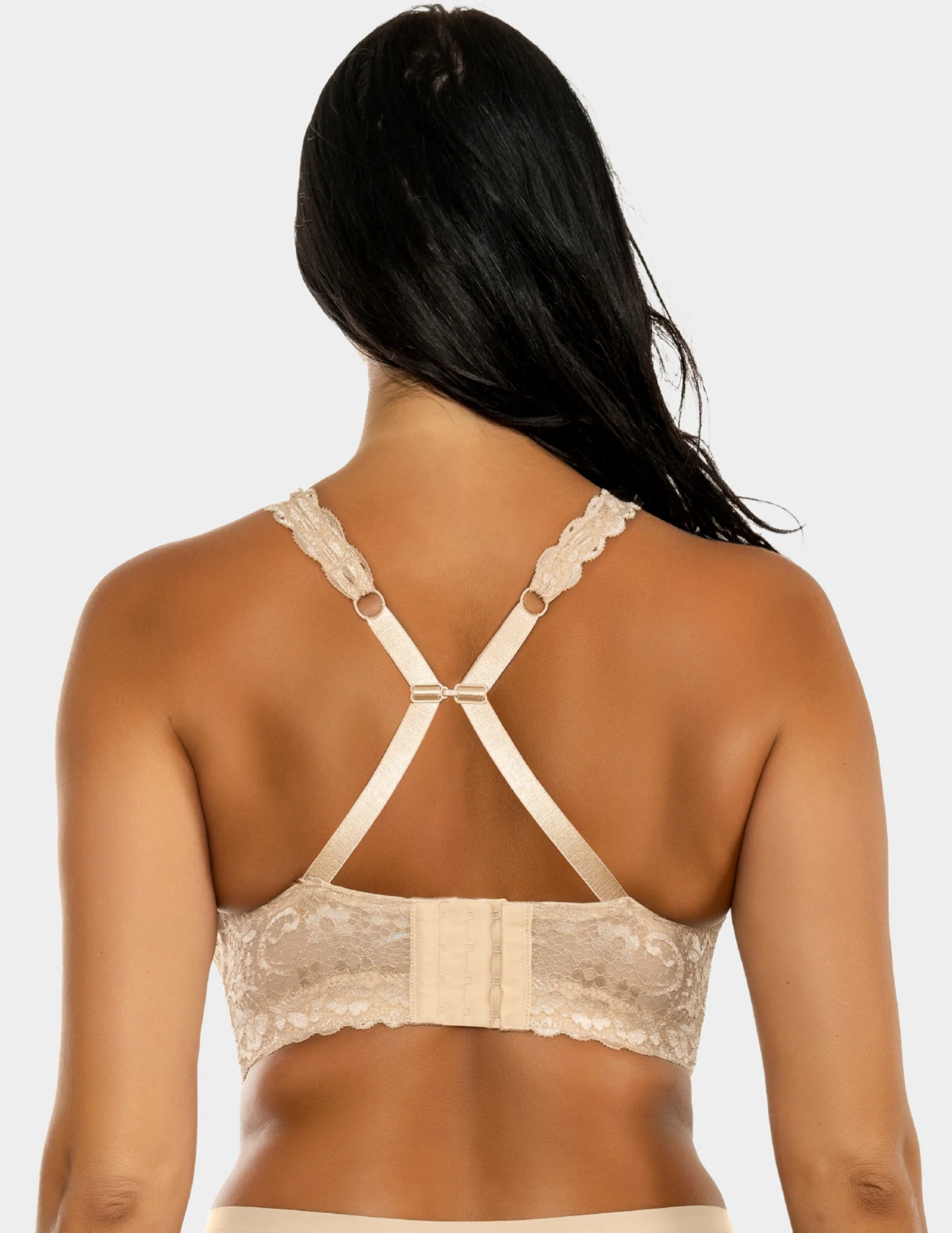 Pretty and Lacy, this wire-free bralette is very supportive and super comfortable. The convertible J-hook feature allows for a racerback option.Ā Adriana in Bare is especially designed for full busted and full figure women.Ā